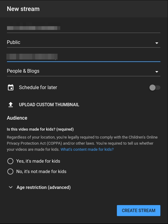 A form with the parameters of the created stream will open. Fill in the required fields and click "CREATE STREAM".